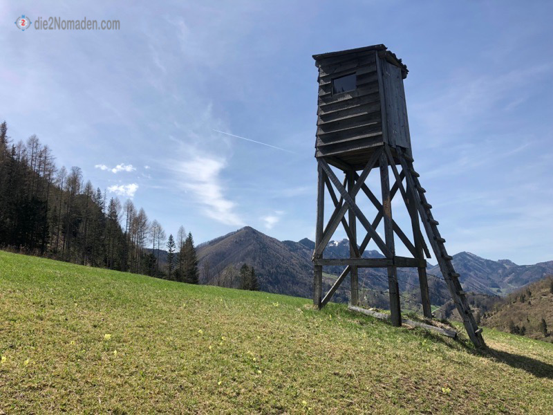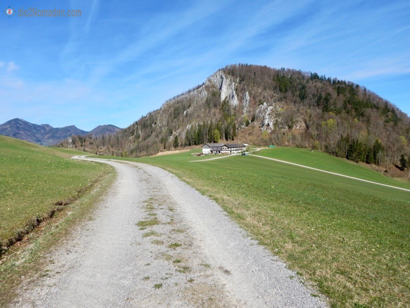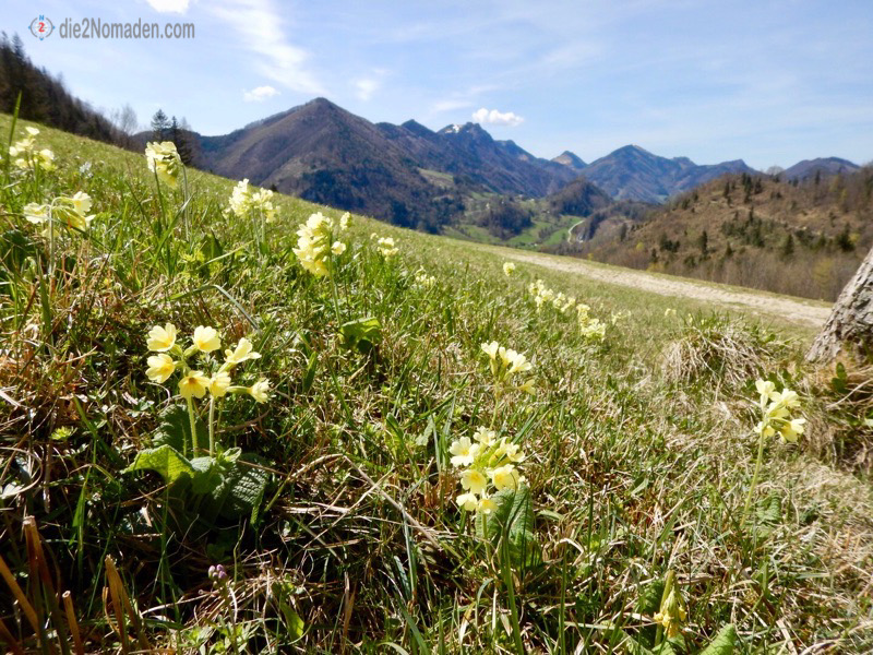 Wanderschuhe geschnürt, Rucksack gepackt und GPS-Gerät aktiviert folgen wir nun der Forststraße leicht ansteigend durch grüne Wiesen, auf denen viele zarte Himmelschlüssel blühen.