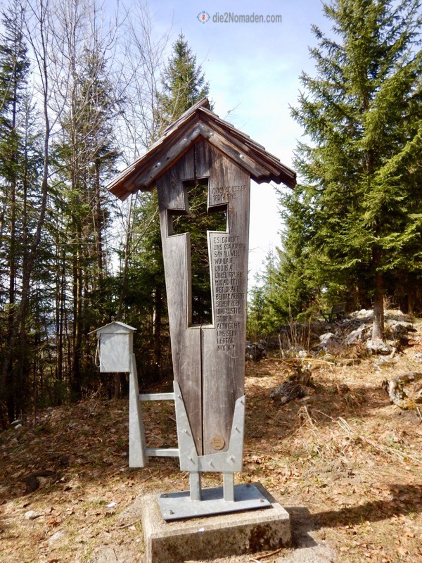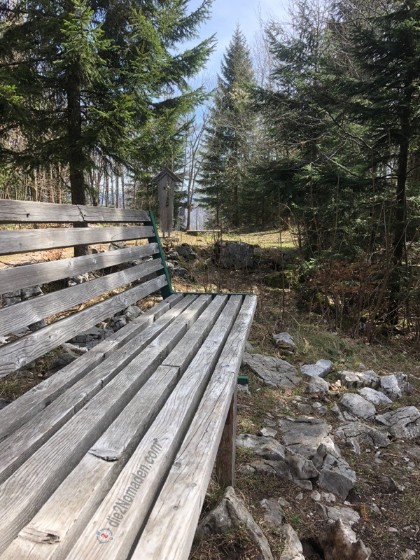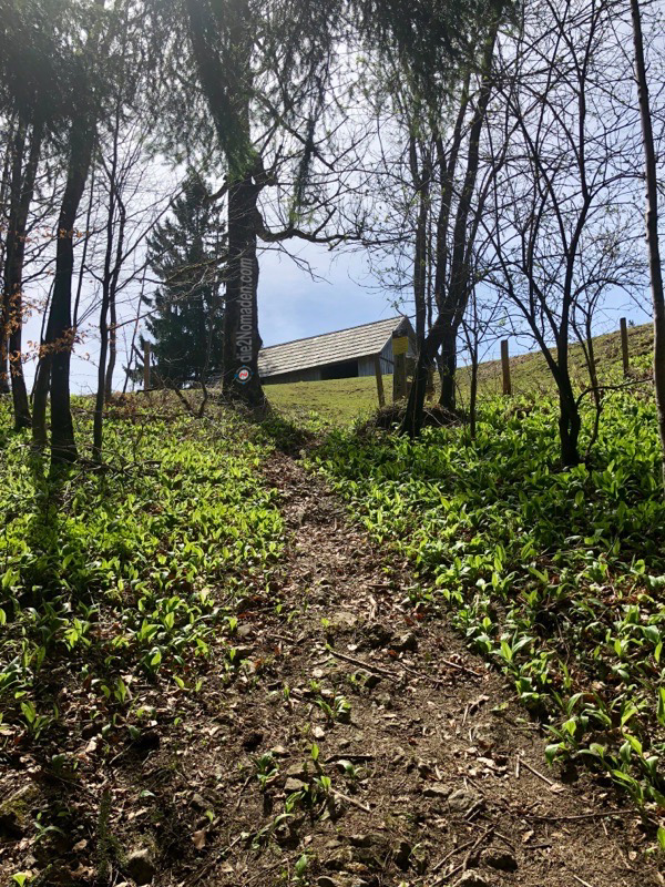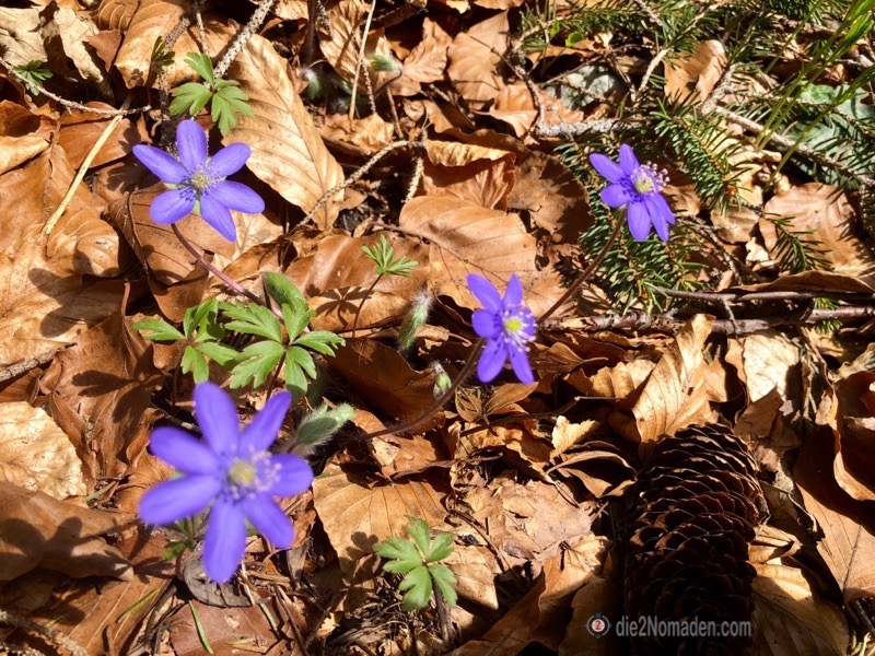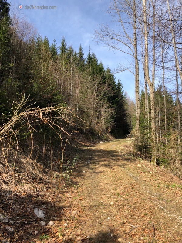 Erst einer Froststraße hinter dem Gehöft folgend, dann ein schmaler kurzer, aber etwas steilerer Aufstieg durch den Wald, vorbei an den ersten Frühlingsboten