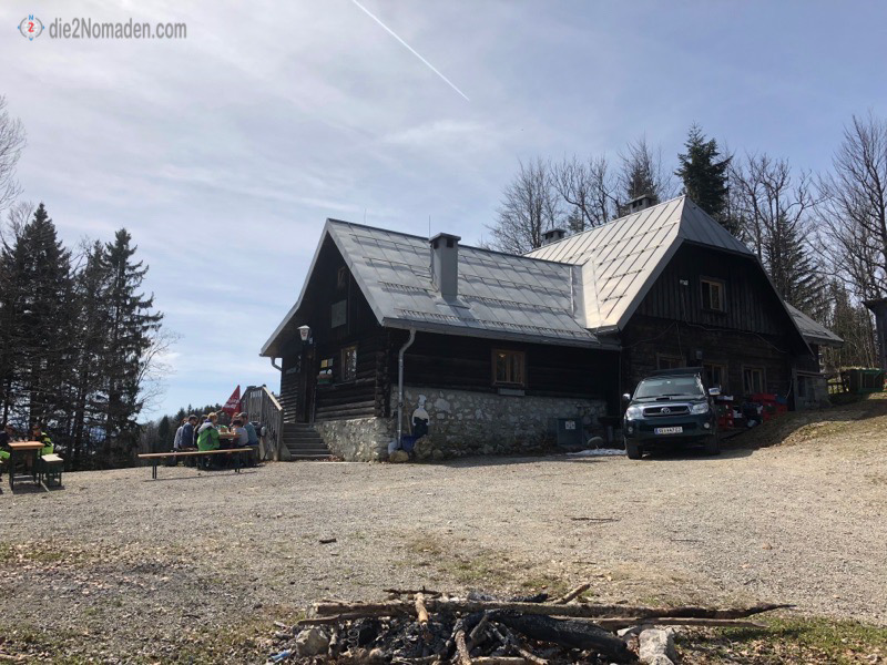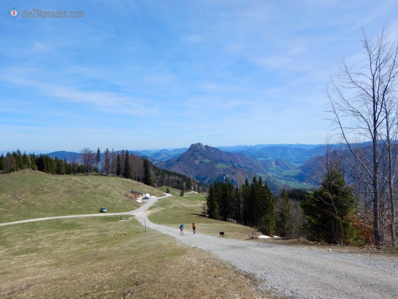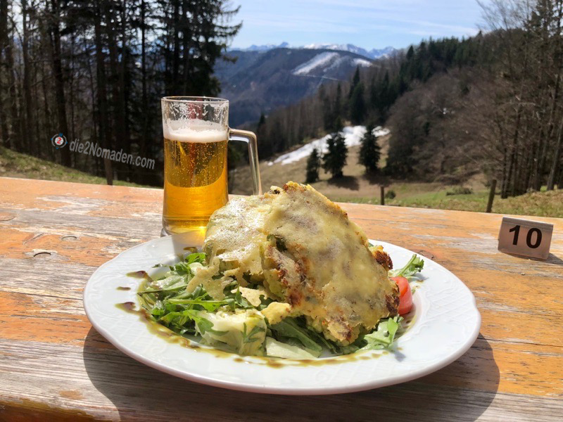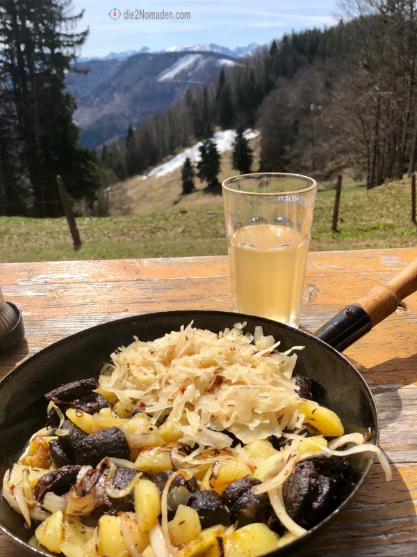 Auf der Anton Schosser Hütte ist noch nicht so viel los, wir ergattern einen Platz in der Sonne mit herrlicher Fernsicht und genießen die Bärlauchknödel und das Blunzengröstl – beides übrigens hervorragend.