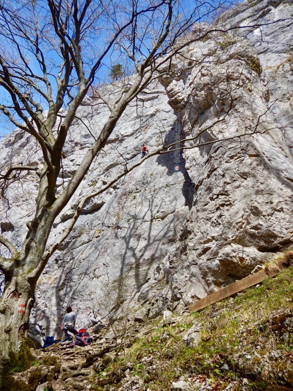 Da uns die Höhle nicht viel Zeit abverlangt, treten wir bald den Rückzug an. Nur noch kurz die Kletterer beobachtet und dann geht es den Weg wieder zurück zum Hintsteinhof.