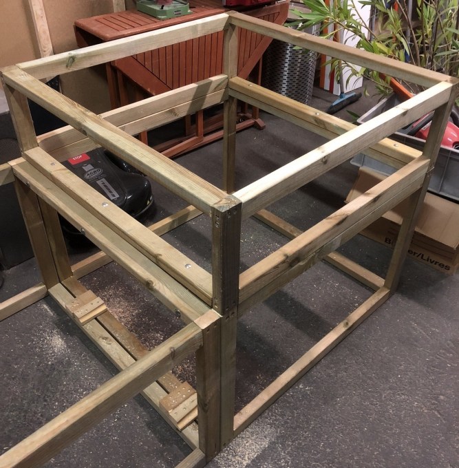 Die Grundidee war, das gesamte Hochbeet in der Werkstatt in 4 Teilen (je Teil 100*100 cm mit unterschiedlichen Höhen) vorzubauen, um es dann im Garten nur noch fertigzustellen.