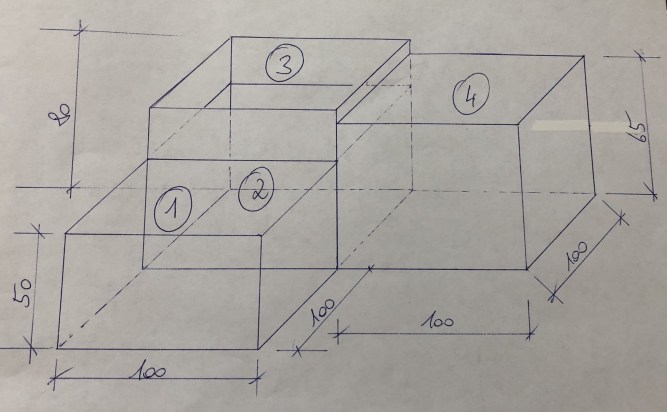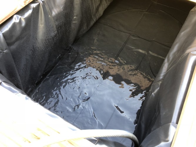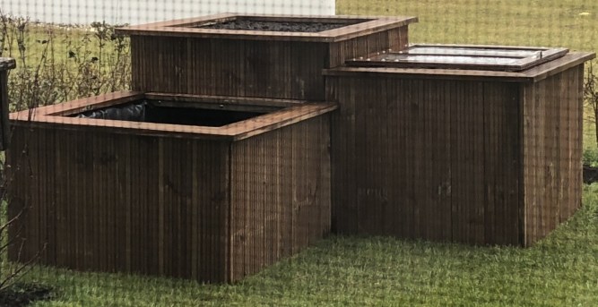 Da der Biotop-Teil mit einer schwarzen Teichfolie im Sommer vermutlich ziemlich warm werden würde, wollte ich mit einem Trick die Wassermenge verdoppeln, obwohl nur ein Teil mit 100*100 cm sichtbar bleibt. Dies war nur möglich, indem ich den Mittelteil nicht als reines Hochbeet ausgeführt habe. Dieser Eckteil bestand aus 2 Teilen.