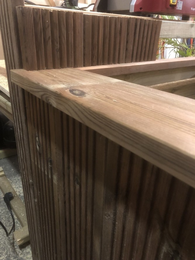 Im Anschluss daran wurde das Ständerwerk mit den Massivholzdielen verkleidet und zwar so, um ein Zerlegen in 4 Einzelteile ohne Probleme zu ermöglichen.