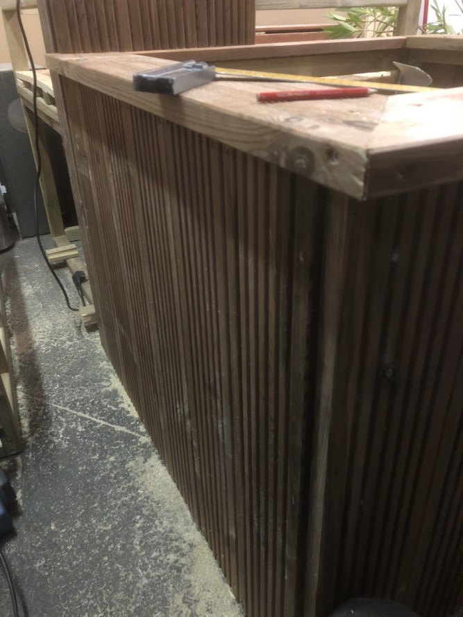 wurden verkleidet mit dunkelbraunen, geriffelten Kiefer-Massivholzdielen (28*145 mm), ebenfalls kesseldruckimprägniert.
