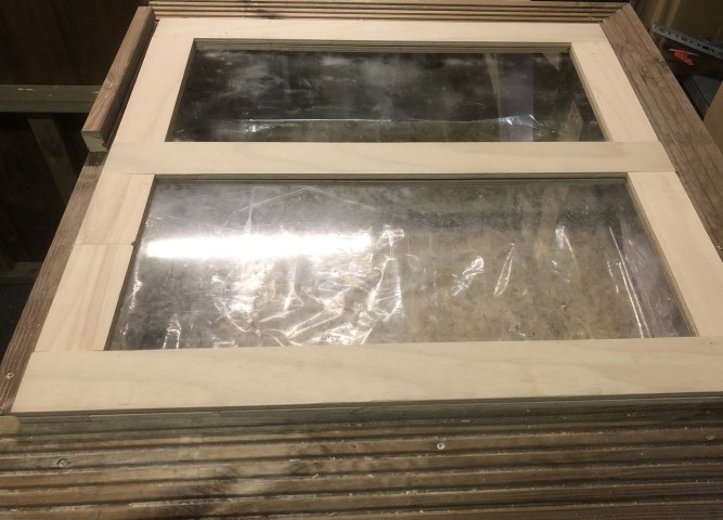 Dazu wurden Plexiglasscheiben zwischen zwei Holzleisten eingenutet, verschraubt, das Holz gestrichen und mit Schanieren und Griff versehen.