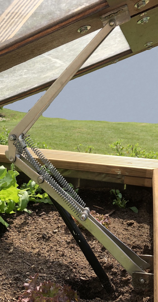 Der Deckel wird mit einem temperaturgesteuerten, automatischen Fensteröffner reguliert, um einen Gewächshauseffekt zu erzielen. Wird es im Beet zu warm, öffnet sich der Deckel kontinuierlich, um einen Hitzestau zu vermeiden. Sollte es kühler werden, schließt der Deckel automatisch und erzeugt so ein kleines Gewächshaus, ganz ohne Strom.