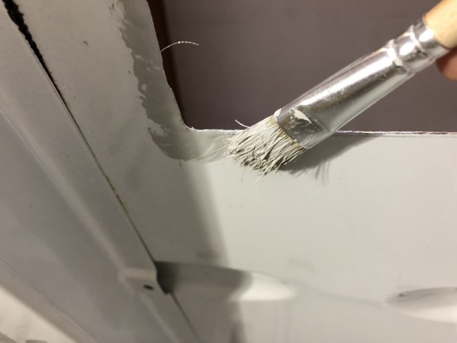 Bevor es nun mit dem Einbau losgeht, werden die Schnittkanten abgegratet und mit Rostschutzgrundierung behandelt.