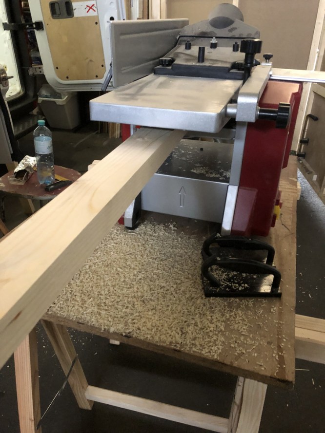 Daher haben wir zuerst die Latten mit der Dickenhobelmaschine eingepasst.
