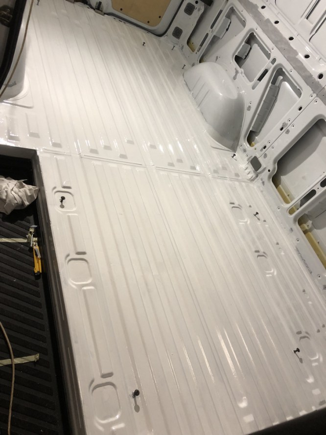 Begonnen haben wir damit, dass das gesamte Bodenblech mit Rostschutzfarbe vollflächig gestrichen wurde.