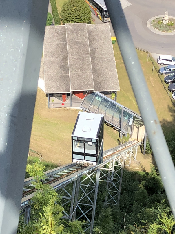 Wer aus gesundheitlichen Gründen den Aufstieg zur Burg nicht per Fuß bewältigen kann, kann den Schrägaufzug an der Rückseite der Burganlage benutzen.