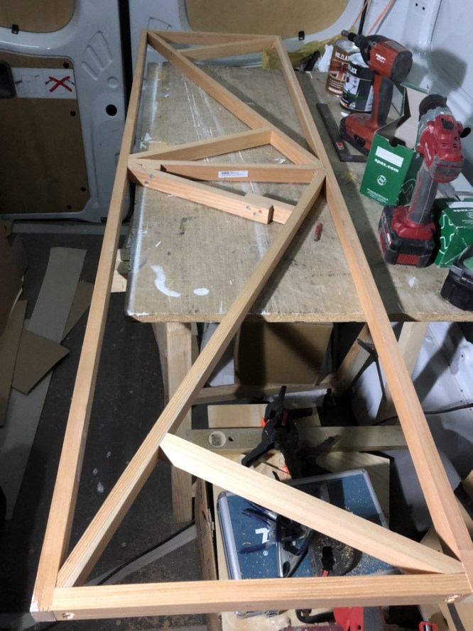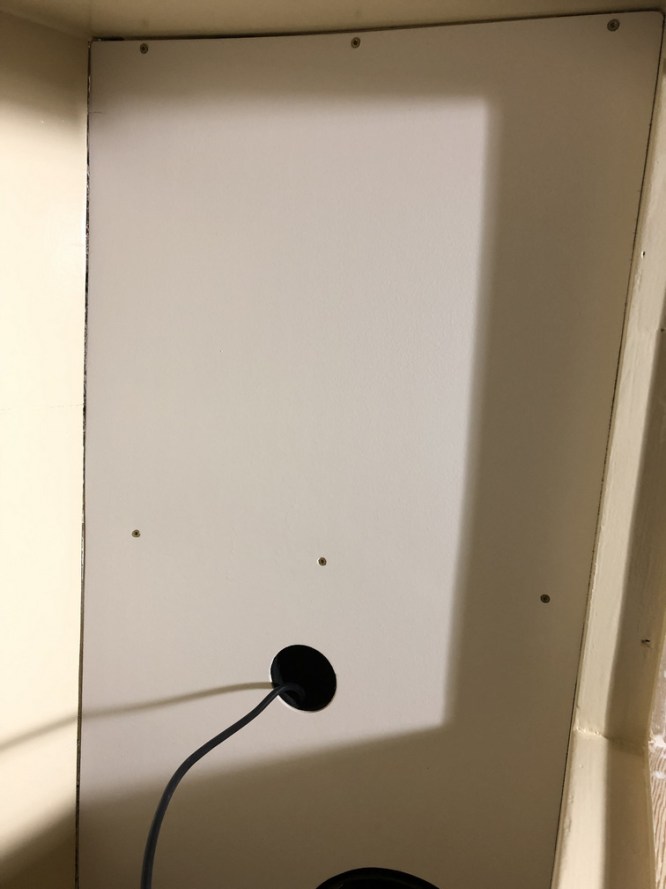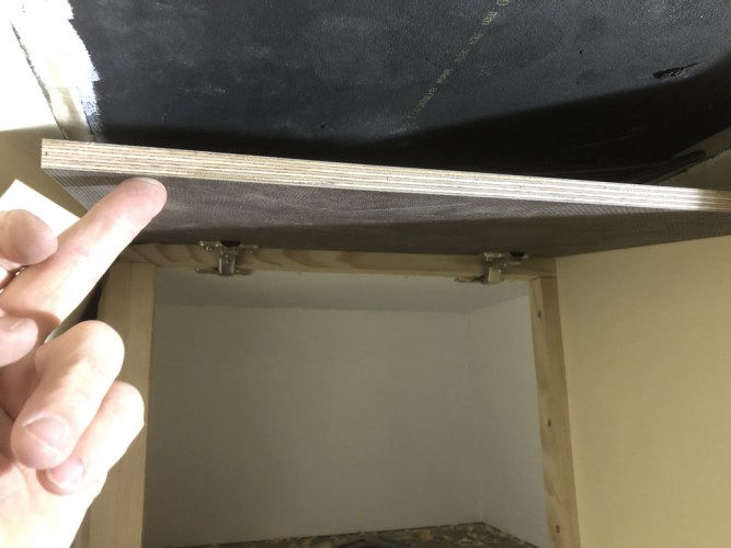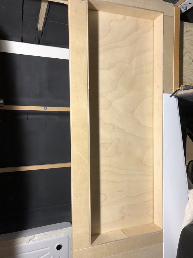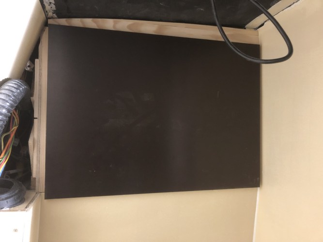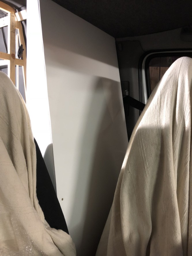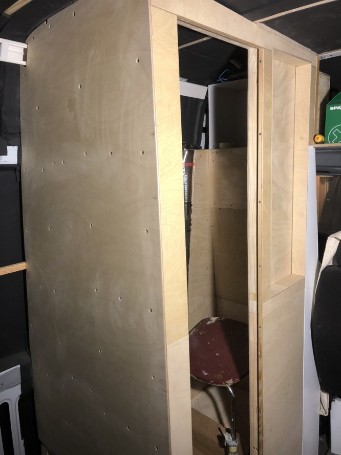 Oberhalb der Position der Trockentrenntoilette wird ein Staufach, welches über den Fahrersitz reicht, verbaut
