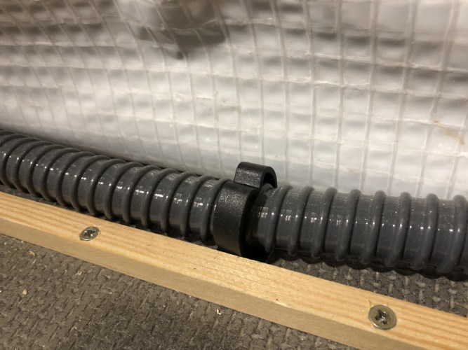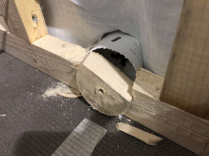 Da der Feuchtraum auch als Trockenraum dienen soll, wird unter der Duschwanne ein 60 mm-Heizungsrohr (aus dem Warmduscherkit) als „Fußbodenheizung“ verlegt. Mittels Lochsäge werden die Durchführungen gebohrt,