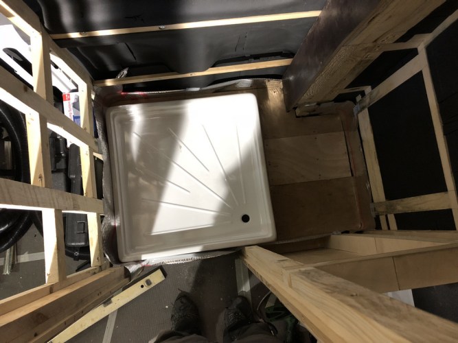 Zwischen Duschwanne und der fahrerseitigen Außenwand bleibt ein ca 15 * 15 cm
