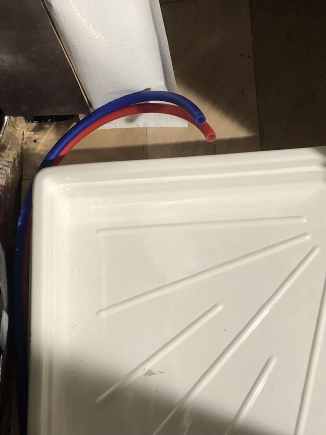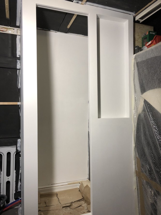 Um den vertikalen Installationsschacht vollständig verschließen zu können, wird nun die Frontplatte lackiert und die Mischarmatur der Dusche eingebaut.