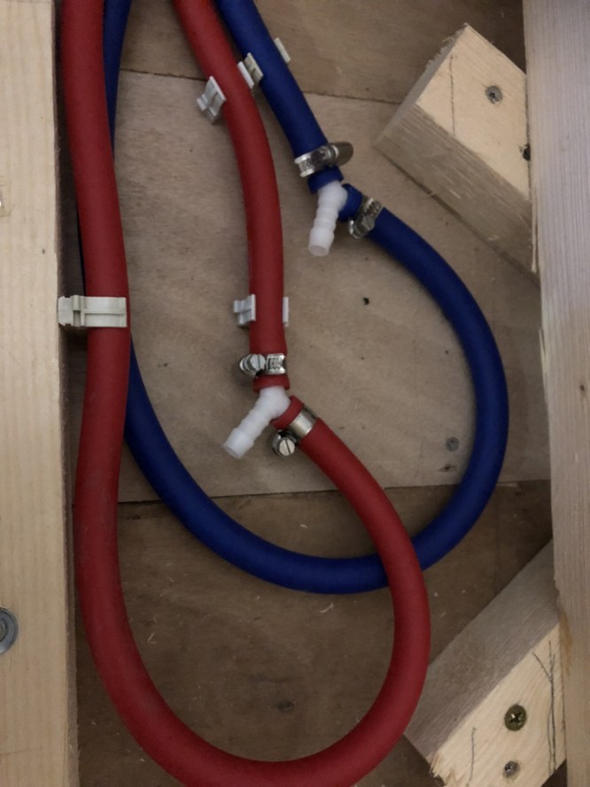 Um die Mikroschalter der Armatur zu aktivieren, wird eine 2 * 1,5 mm²-Leitung zum Schaltschrank neben der Schiebetüre verlegt. Da die Pumpe über 6 m entfernt in den Tanks verbaut ist und 75 W Leistung braucht, werden wir im Schaltschrank ein Relais verbauen, da die hohen Ströme sonst den Mikroschalter in der Armatur ruinieren würde. Außerdem müssten auf diese Länge wesentlich stärkere Kabel verbaut werden, die jedoch schwerer und teurer sind.