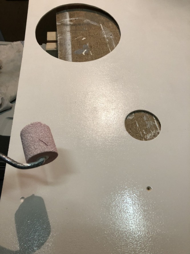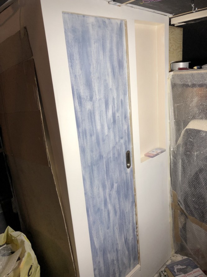 An der Außenseite der Türe wird nun erstmals unsere Farbstruktur „Shabby Chic“ aufgetragen und mit Klarlack versiegelt.