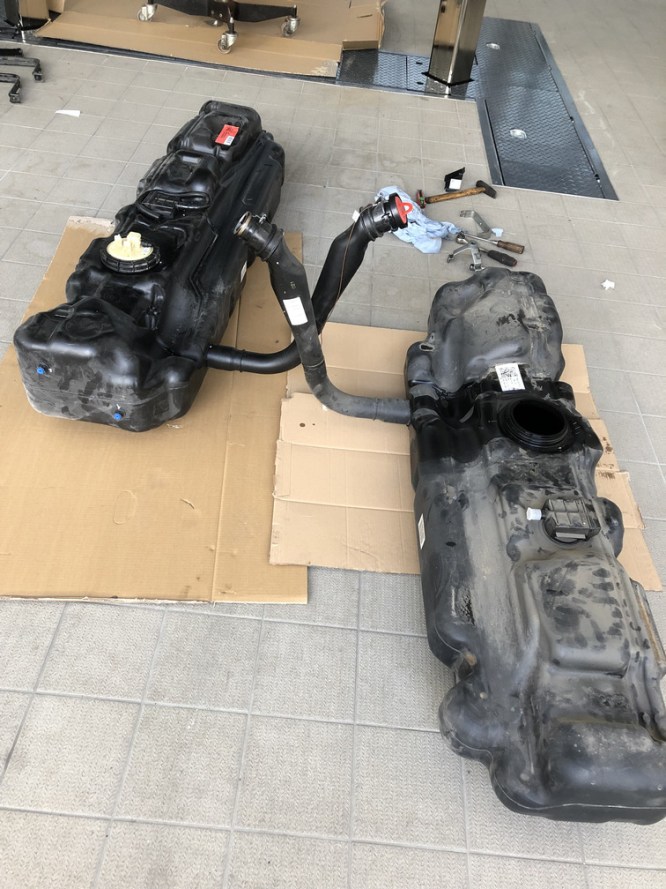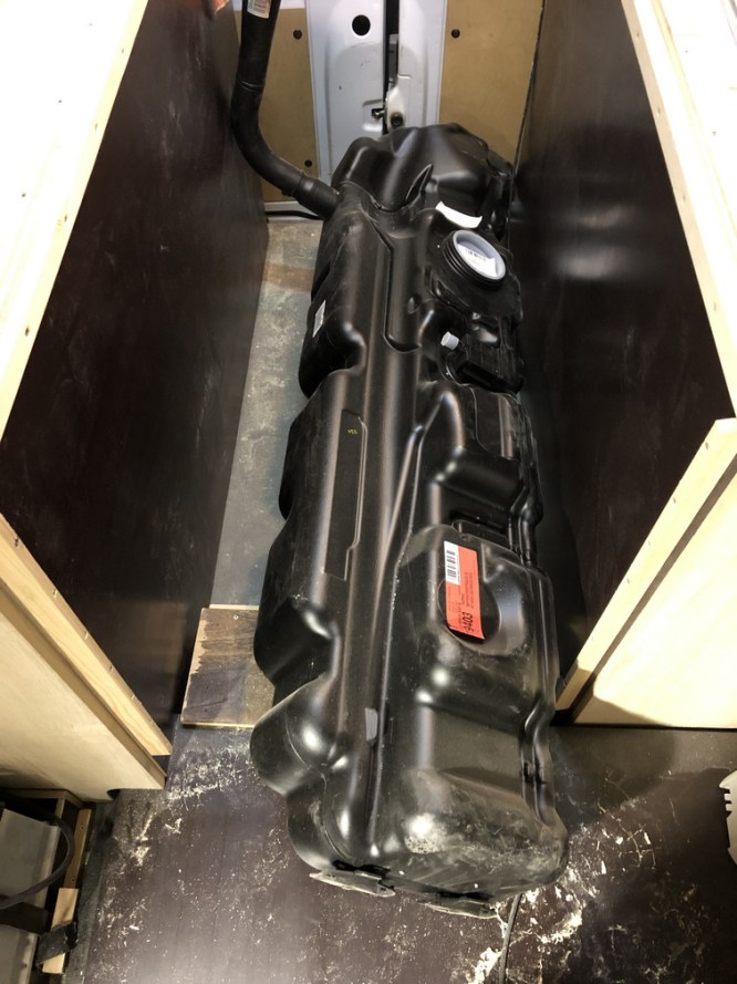 Da uns unsere Reisen auch an Orte führen werden, an denen es nicht an jeder Ecke eine Tankstelle gibt und wir eine Diesel-Standheizung verbauen wollen, haben wir uns für einen Umbau auf einen 100 Liter-Tank entschieden.