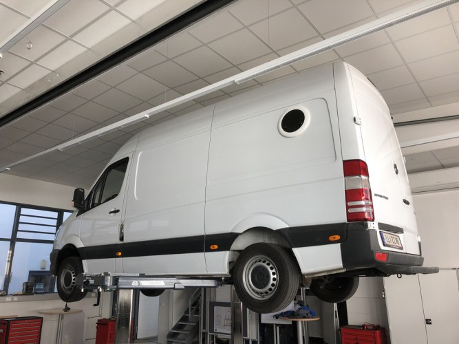 Dazu benötigten wir eine Werkstätte mit Hebebühne, welche auch Transporter mit Hochdach ohne Probleme stemmen kann.