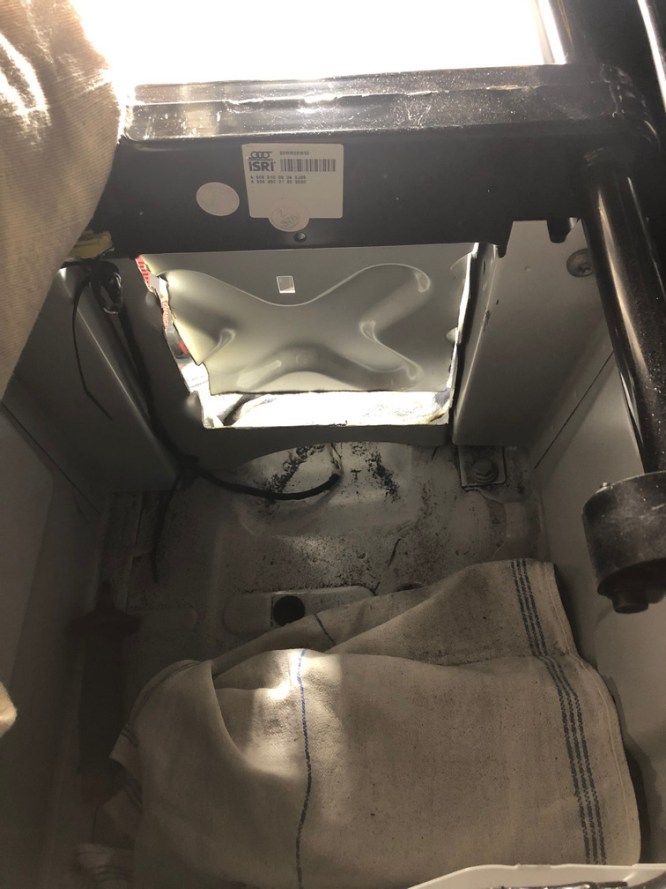 Um den Boiler unter die Beifahrersitzbank zu bekommen, musste die Trennwand der Sitzkonsole ausgeschnitten werden