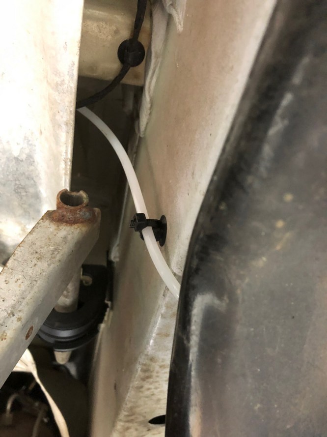 welche wir nicht direkt am Rahmen, sondern an einem Anbauteil montiert haben, geleitet. Dadurch erhoffen wir uns weniger Geräuschübertragung durch die Pumpe in den Innenraum. Sollte es dennoch nicht genügen, können wir nach einigen Testfahrten zusätzlich noch Dämpfer einbauen.