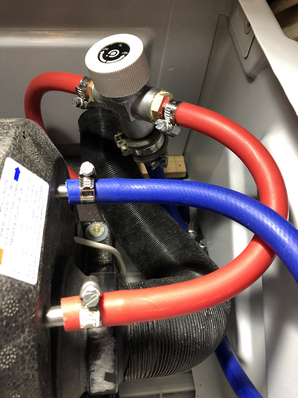 Wasserseitig wird ein einstellbares Mischventil mitgeliefert, um Verbrühungen durch zu heißes Wasser zu vermeiden.