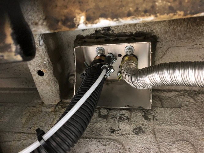 welche wir nicht direkt am Rahmen, sondern an einem Anbauteil montiert haben, geleitet. Dadurch erhoffen wir uns weniger Geräuschübertragung durch die Pumpe in den Innenraum. Sollte es dennoch nicht genügen, können wir nach einigen Testfahrten zusätzlich noch Dämpfer einbauen.