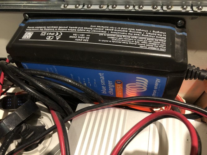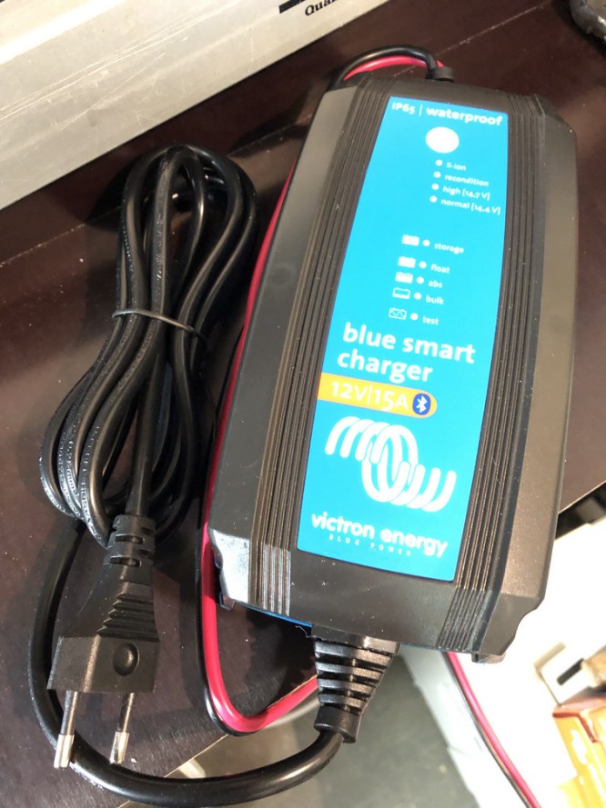 Um die Batterien mittels Landstrom zu laden, benötigen wir ein Ladegerät. Wir haben uns für ein Victron BlueSmart Batterieladegerät IP65 12/15 mit 15A Ladestrom entschieden.