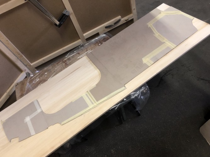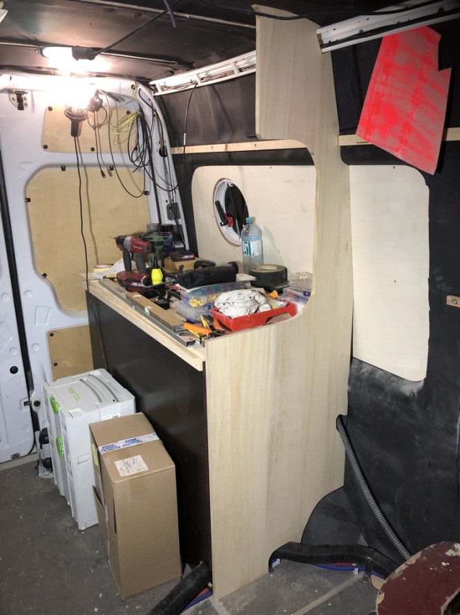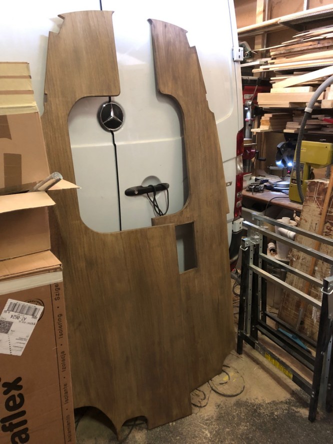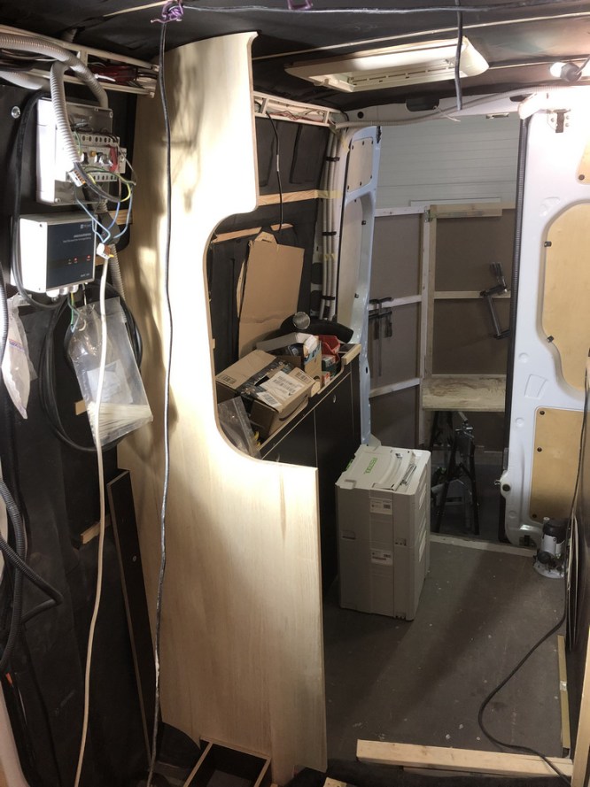 Diese Wand soll im Anschluss an den Tankverbau links und rechts aufgestellt werden. Da fahrerseitig die Abwassertanks weniger Platz verbrauchen, ist hier die Wand um ca. 15 cm nach hinten versetzt. Dadurch ergibt sich später im Fußbereich des Bettes ein Maß von ca. 130cm und im Kopfbereich, schiebetürseitig, ca. 145 cm.