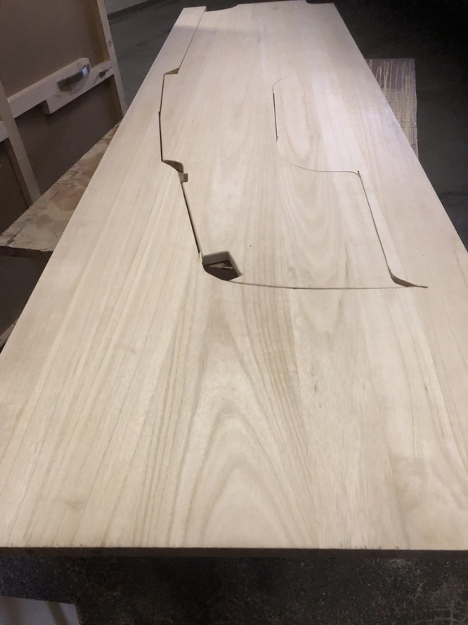 Die restlich Öffnung wird später ebenfalls mit einer Verkleidung aus Paulownia verschlossen. Verkleidung und Tisch können demontiert und dadurch im Notfall für eine volle Durchreiche zwecks Transport sperriger Güter geöffnet werden.