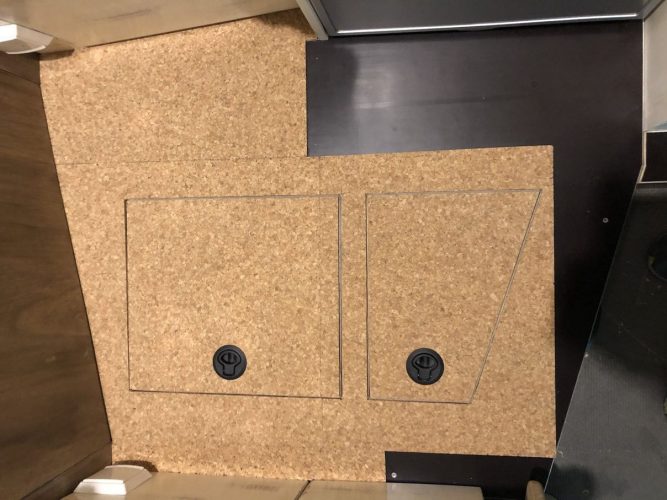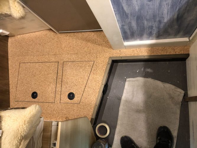Das gesamte Podest wird danach mittels 5 mm starkem Kork ausgekleidet und wirkt auch als Dämmung gegen die Kälte. Außerdem ist ein Korkboden angenehm, wenn man barfüßig unterwegs ist.