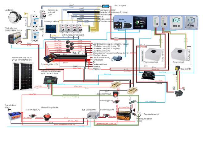 Nach SEHR LAAAANGEN Überlegungen, wie wir unseren Kastenwagen ausbauen wollen und somit unsere Leitungen verlegen sollen, haben wir uns schlussendlich für den unten dargestellten, schematischen Schaltplan entschieden.