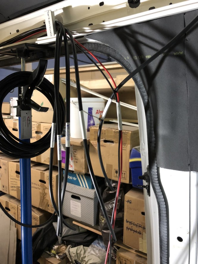 Wie schon in einem vorangegangenem Beitrag „Bullaugen einbauen und Kabelkanäle montieren“ erwähnt, verläuft bei unserem Hrn. Hofrat jeweils links und rechts längs, sowie über der Fahrerkabine und über der Hecktüre quer, ein Kabelkanal. Über dieses Ringsystem haben wir versucht, alle Kabel aufzufangen und zum Schaltschrank zu führen.