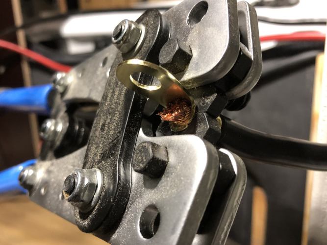 Die Kabel mit größerem Querschnitt werden mit den passenden Kabelschuhen durch eine speziellen Crimpzange verpresst.