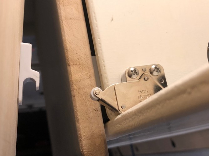 Die Türen werden je mittels eines Federschnäppers gehalten und geben die Klappe nach dem Andrücken wieder frei. So werden keine Griffe benötigt.