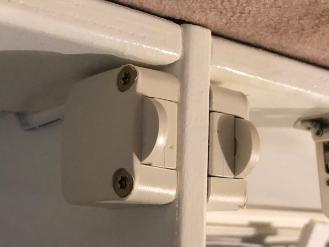 Die Türen werden je mittels eines Federschnäppers gehalten und geben die Klappe nach dem Andrücken wieder frei. So werden keine Griffe benötigt.