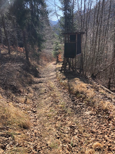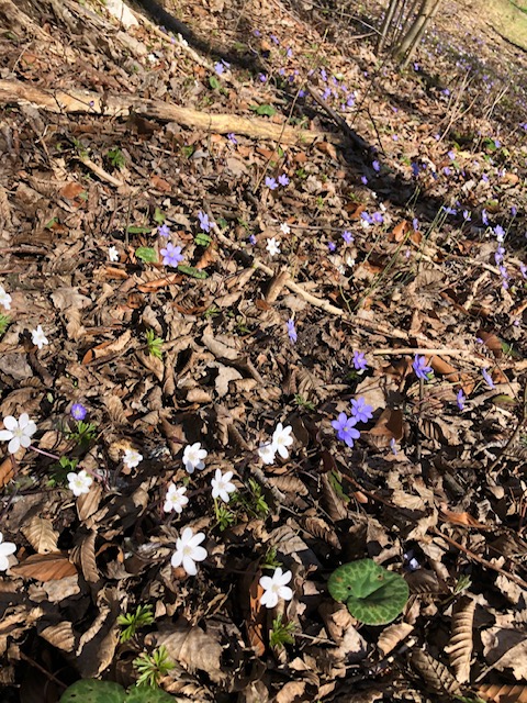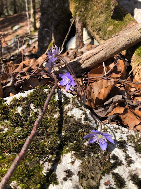 Zuerst ein kurzes Stück über einen Wiesenweg und dann hinein in einen lichten Wald, dessen Weg gesäumt ist von Leberblümchen und Buschwindröschen. Das Laub knirscht unter unseren Schritten und es geht ein kurzes Stück bergauf. Schon bald kommen wir aus dem Wald und haben eine wunderschöne Fernsicht auf die schneebedeckten Gipfel in der Ferne, die einen herrlichen Kontrast zum blitzblauen Himmel bilden. Ein liebevoll hergerichtetes Häuschen mit einem hübschen Garten erfreut uns und dann geht es wieder leicht bergauf bis zu einer Straße, die wir ein Stück lang gehen. Den Einstieg auf den Wanderweg haben wir fast verpasst, müssen umkehren und dann sind wir wieder auf dem richtigen Weg hinein in den Wald. Wir folgen diesem Weg bis zu einem Kahlschlag, wo uns am Ende ein Wegweiser die Möglichkeit zum Gipfelkreuz des Ebenwiesl-Stein bietet.