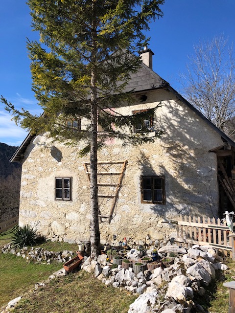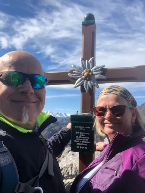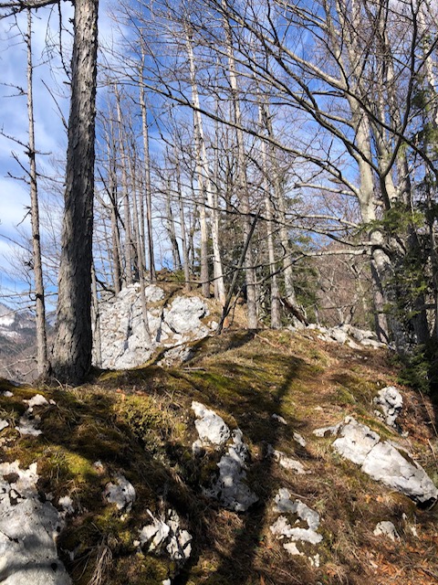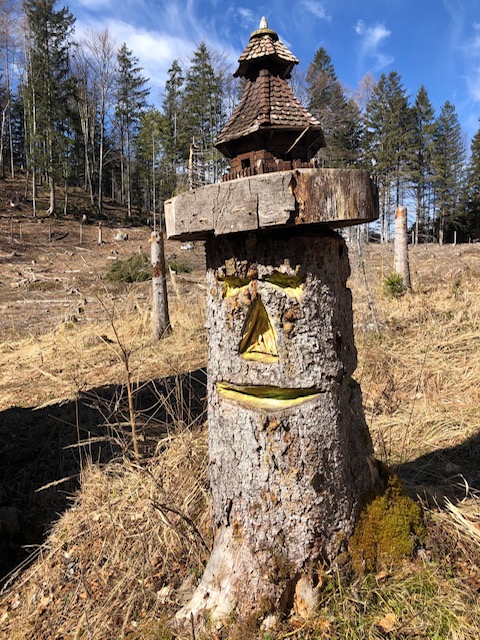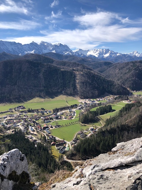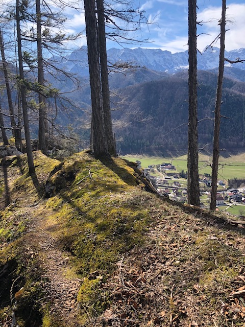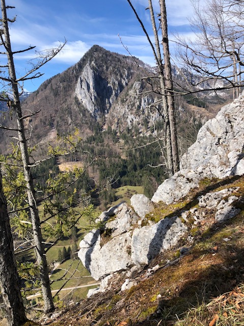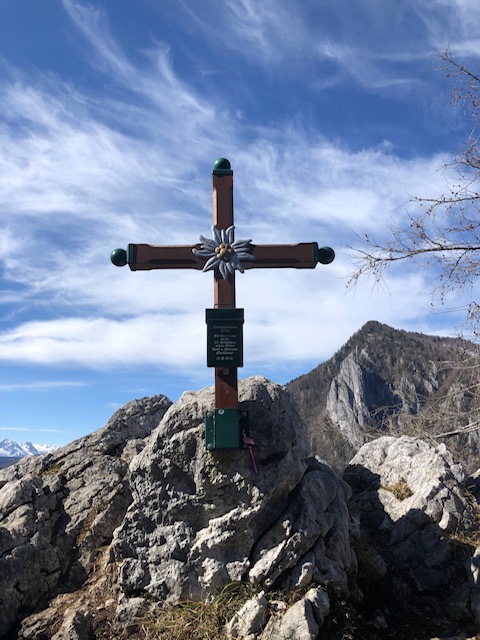 Das lassen wir uns natürlich nicht entgehen und steigen den schmalen Waldweg hinauf, bis wir zum ersten Kreuz kommen. Ein wunderschönes kleines Kreuz mit einem Edelweiß steht auf dem Felsen und wir schauen entzückt hinunter auf Steyrling. Ein paar Fotos später folgen wir dem kleinen ausgetretenen Weg weiter und erreichen nun das richtige Gipfelkreuz vor dem Panorama der großen schneebedeckten Berge etwas versteckt in den Ästen der Bäume. Noch einige Meter und dann stehen wir auf einem kleinen Plateau, das uns herrliche Blicke über Steyrling bis hinein in die Bergwelt bietet.Schließlich reißen wir uns los von da oben, wo die Häuser so winzig klein erscheinen und unsere Sorgen und Ängste für ein paar Augenblicke nicht mehr unsere Köpfe und Herzen berühren, und wandern wieder abwärts.