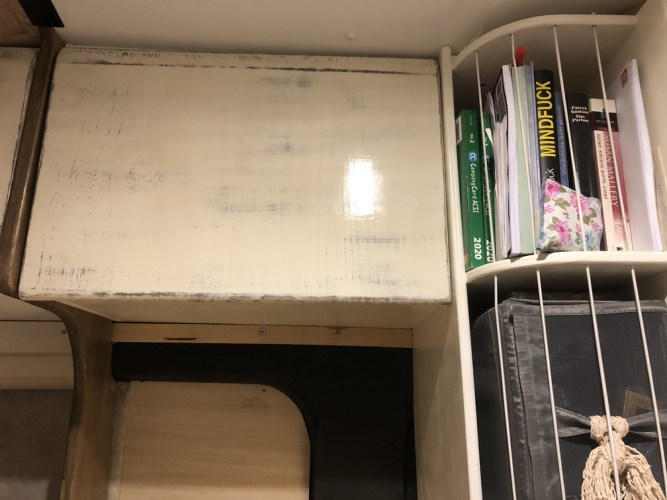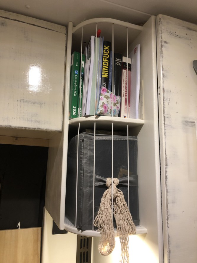 Zwischen den Bücherbords und der Trennwand wurde in gleicher Höhe der Hängeschränke im Schlafbereich ein weiterer montiert.