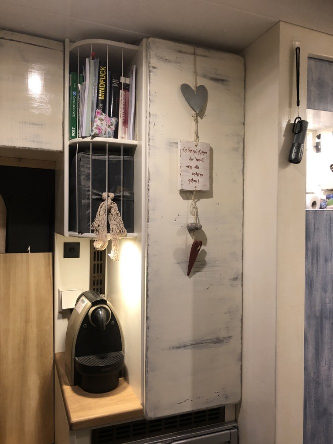 Über der Kaffeemaschine sind zwei Bords für Bücher oder Ähnliches angebracht.