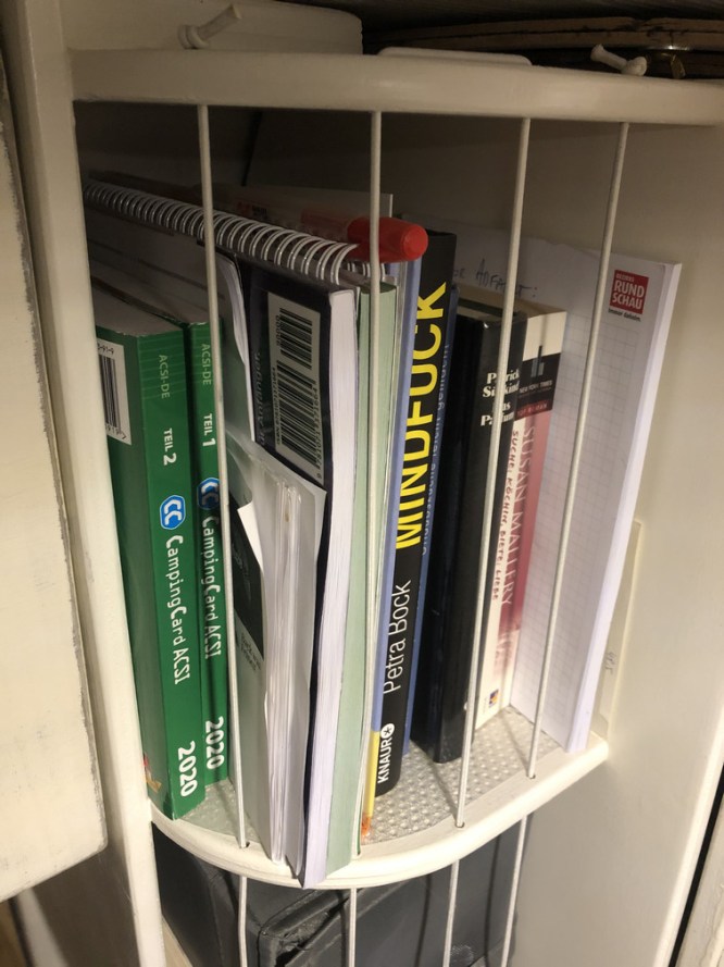 Die Bücher, und bei uns die Faltschachtel mit den Kaffeepads, der manuellen Espressomaschine, usw., werden mittels 3 mm-Spanngummi gehalten.