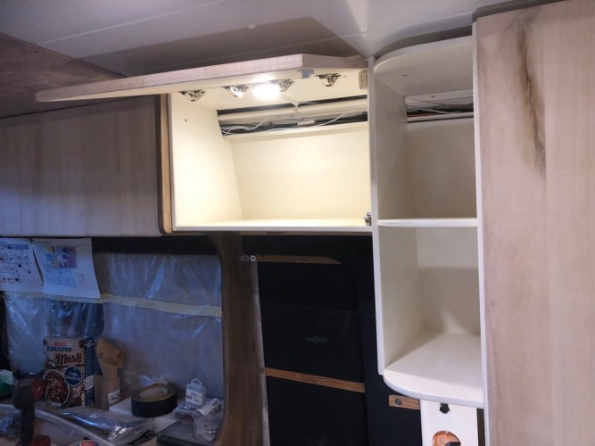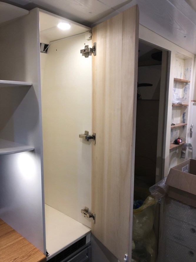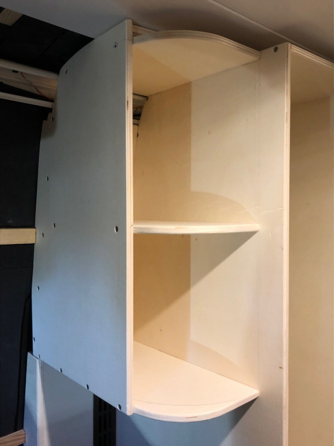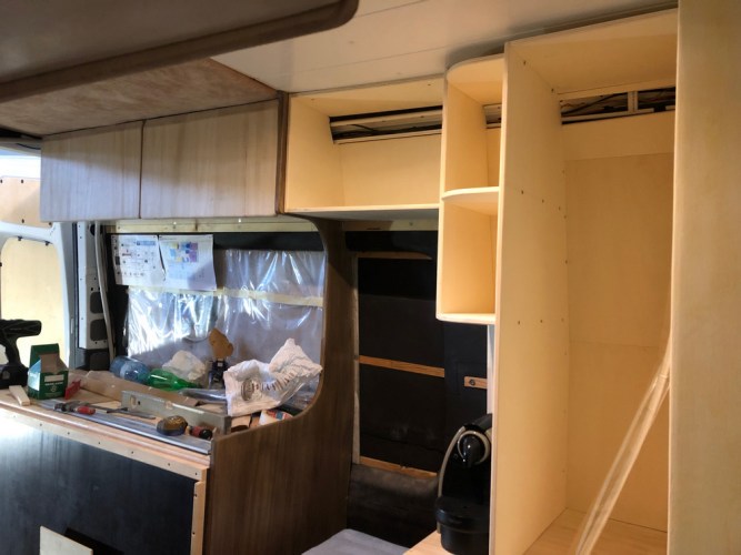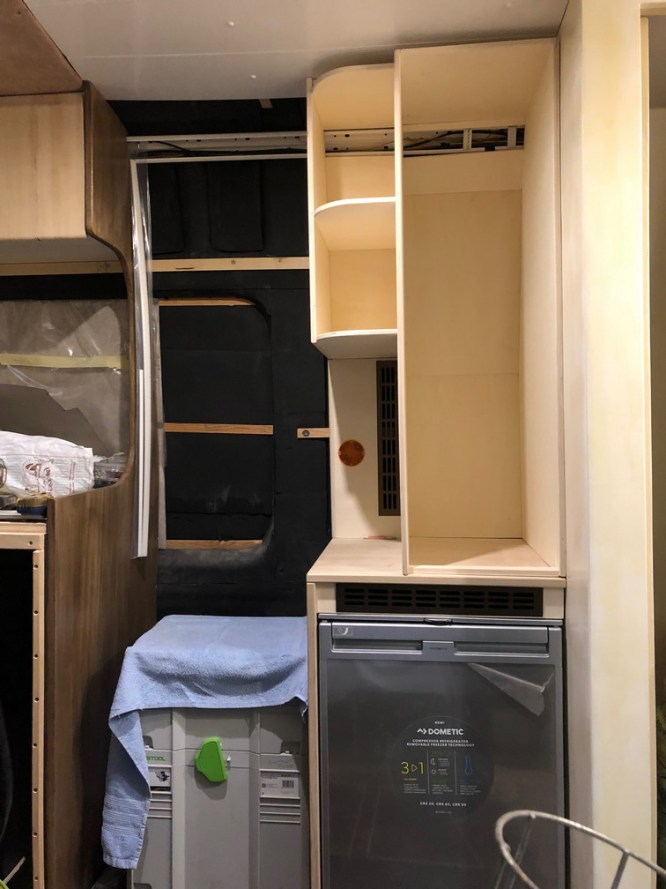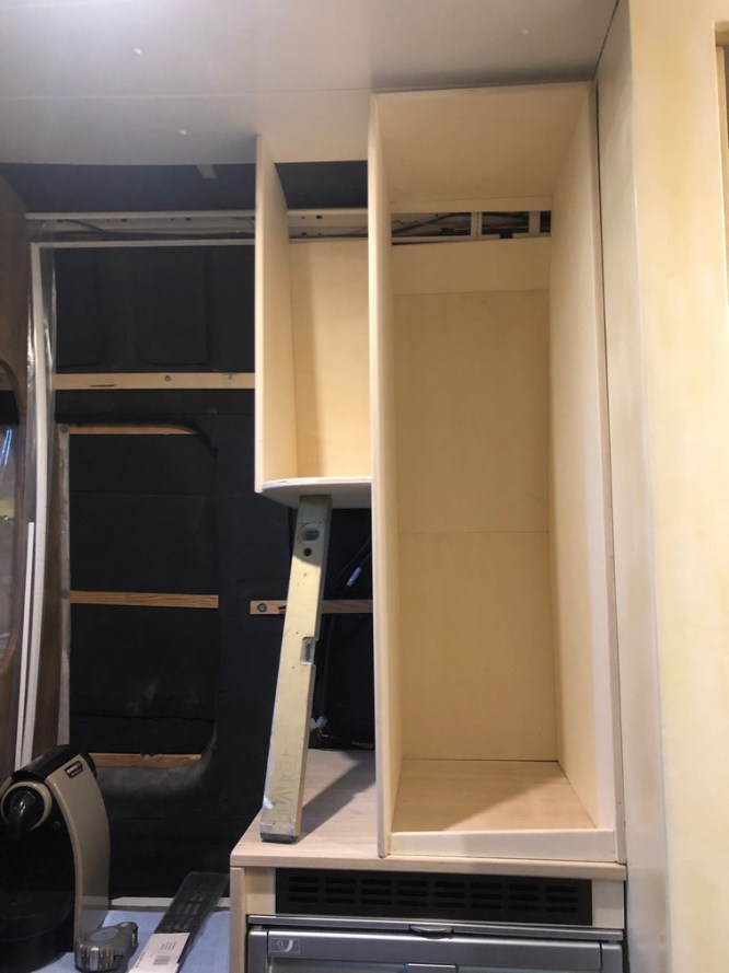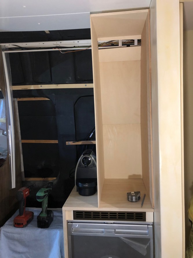 Auf dem Verbau des Kühlschranks haben wir einen schmalen, 30 cm breiten Kleiderschrank verbaut. Hier haben wir wieder 12 mm Pappelsperrholz verwendet.