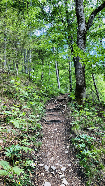 Wir parken beim ehemaligen „Deutschen Haus“, einem Gasthaus, das jetzt zu unserem Glück wieder bewirtschaftet wird und wandern hinter dem Gasthaus den markierten Weg Richtung Offensee. Die Wanderung zum Ameisstein ist nicht markiert, außer mit Steinmanderl an den Abzweigungen.