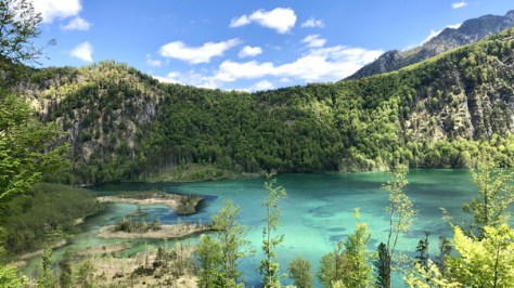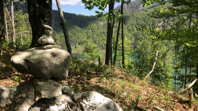 Dafür ist der Weg auf den Hügel gesäumt mit traumhaften Ausblicken auf den einzigartigen grünen Almsee mit seinen unterschiedlichen Farben. Speziell an sonnigen Tagen hat man das Gefühl, in der Karibik zu sein. Wir genießen die Ausblicke, die der Ameisstein ringsum bietet und steigen dann wieder bergab.