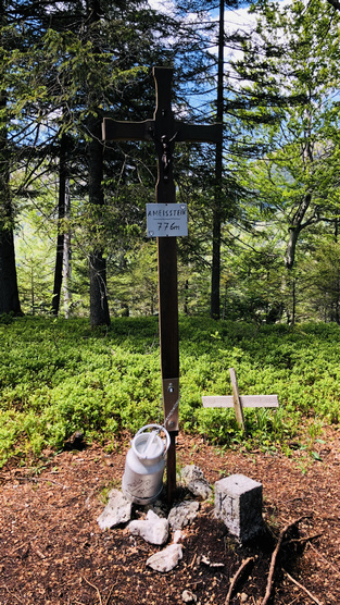Kurz vor dem Gipfel steht ein Bankerl, auf dem man einen wunderbaren Ausblick ins Tote Gebirge sowie den Traunstein hat. Das Gipfelkreuz selbst ist eher unscheinbar, doch in der darunter angebrachten Milchkanne (auf gut österreichisch „Mülibitsch’n“) ist das Gipfelbuch untergebracht.