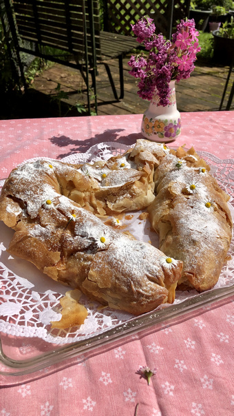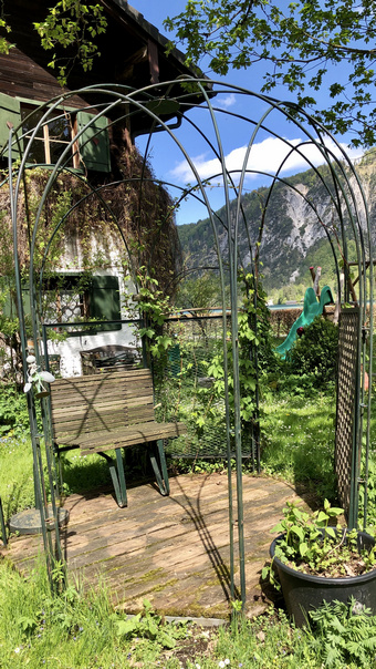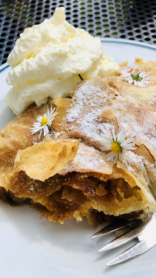 Unten angekommen steht im Gastgarten des ehemaligen Gasthof „Deutsches Haus“, das nun Gasthof Gilda Gruber heißt, ein Tisch in der Wiese und darauf ein noch warmer, duftender, ausgezogener Apfelstrudel, geschmückt mit Gänseblümchen. Das Fenster zum Gasthof ist weit geöffnet und eine Tafel besagt, dass hier Kaffee und allerlei Kuchen, Torten, Strudel gekauft werden kann.