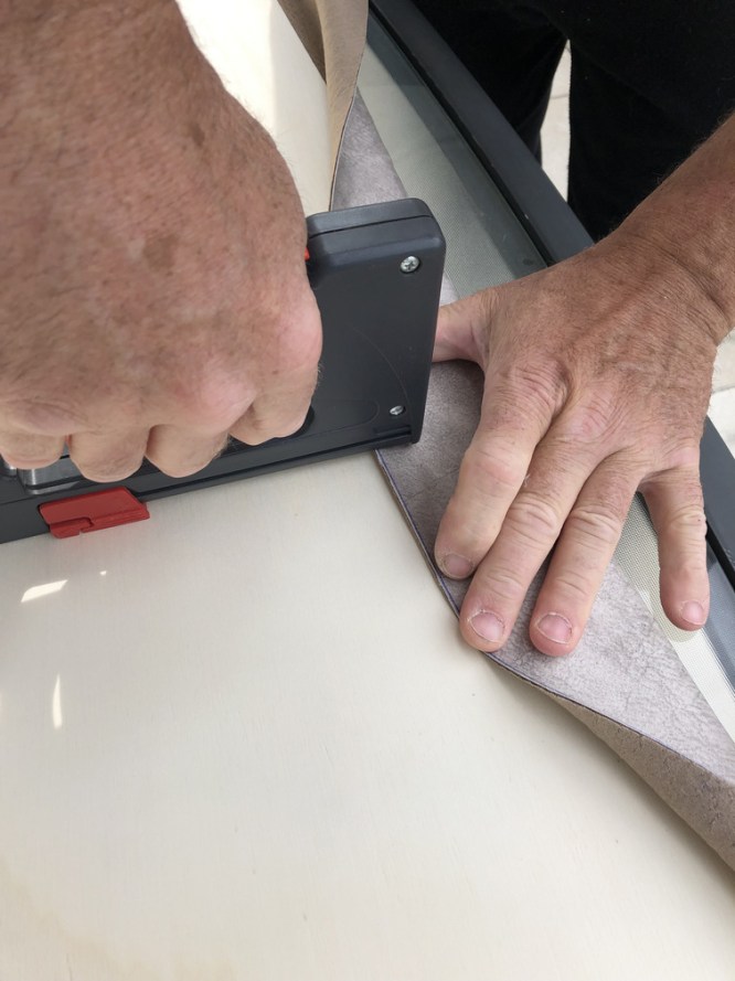Abschließend wurde alles mit einem strapazierfähigen Stoff, den wir von einem ortsansässigen Sattler gekauft haben, überzogen und mittels Handtacker und Klammern festgenagelt.