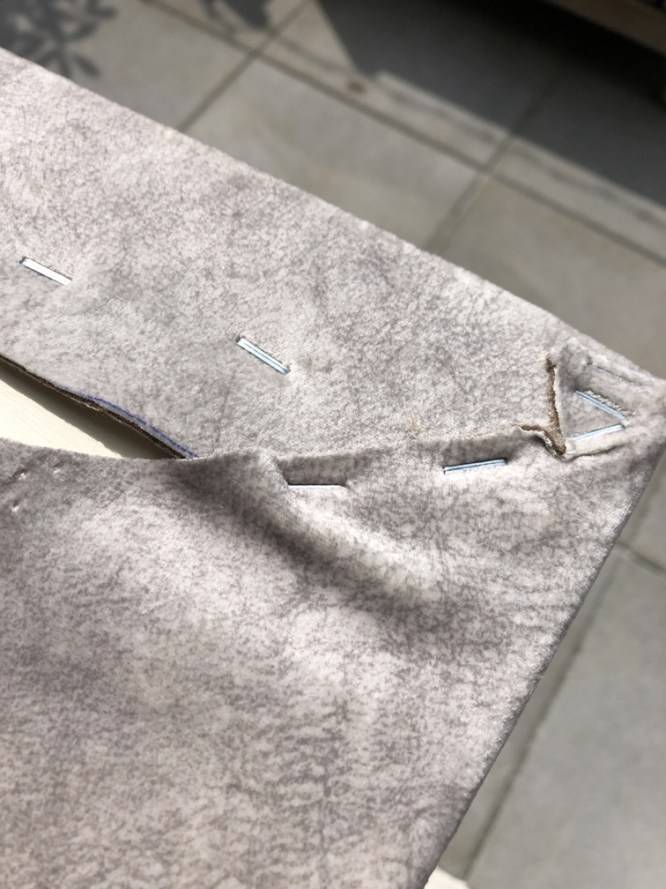 An den Ecken versuchen wir den Stoff einlagig zu verarbeiten, damit wir im montierten Zustand nicht wieder Breite (auch wenn es nur Millimeter sind) verlieren.