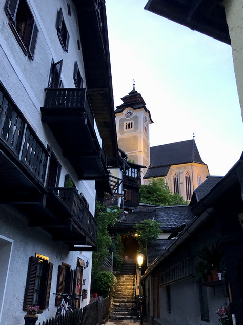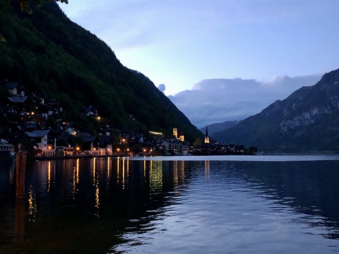 Nach dieser Stärkung nehmen wir uns den Tipp des CP-Besitzers zu Herzen und wandern über den CP in den Wald hinauf bis zu einem Aussichtsplatz mit einem Bänkchen. Wir genießen die Stelle da oben bis uns das erste Donnergrollen überrascht und wir eilig zum Camper zurückkehren. Nach einem kurzen Gewitterguss klart es gleich wieder auf und nichts hält uns davon ab, nochmals in das nun menschenleere Hallstatt zu spazieren. Nur Hundebesitzer sind noch auf dem Weg und Hallstatt bei Nacht ist nun auch für uns eine Neuheit.