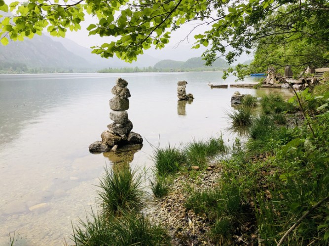 Am nächsten Morgen ist es diesig. Wir packen unsere sieben Sachen und mit den ersten Regentropfen fahren wir zurück nach Steeg. Dort biegen wir ab Richtung der Orte Ober- und Untersee, fahren auf wirklich sehr schmalen Straßen mit einigen Ausweichen den See entlang, parken und wandern das letzte Stück der offiziellen Straße, die dann in einen Radweg endet, der rund um den See führt. Da nun der Schnürlregen eingesetzt hat, beschließen wir uns auf den Heimweg zu machen. Wir nehmen die Route durch Bad Ischl und durch das Weißenbachtal und auf der unteren Seeseite des Attersees zurück nach Hause. Allerdings nicht ohne vorher im Ort Attersee einen Spaziergang zu machen und uns vor der Pizzeria im Ort eine Pizza to go zu bestellen.