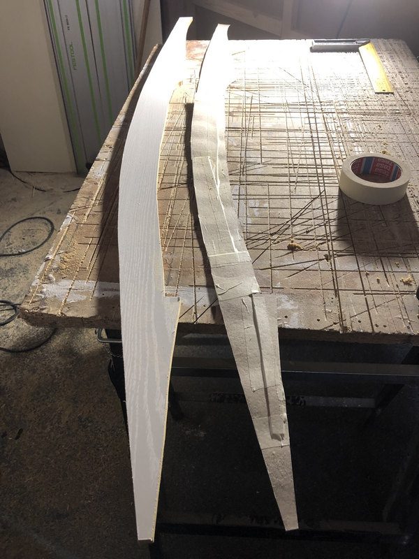 Nun wurde stirnseitig ein Streifen 8mm-Pappelsperrholz angepasst, gebogen und verschraubt.